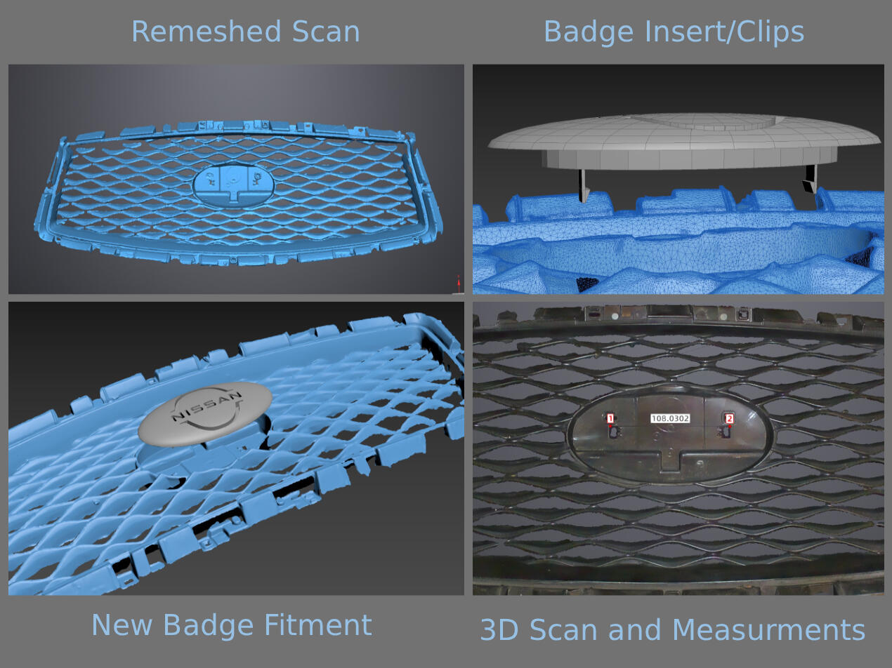 When the original badge was missing, we scanned the grille and designed a custom emblem with integrated clips for a precise snap-in fit. The result: a clean replacement that restores the look and mounts securely without modification.